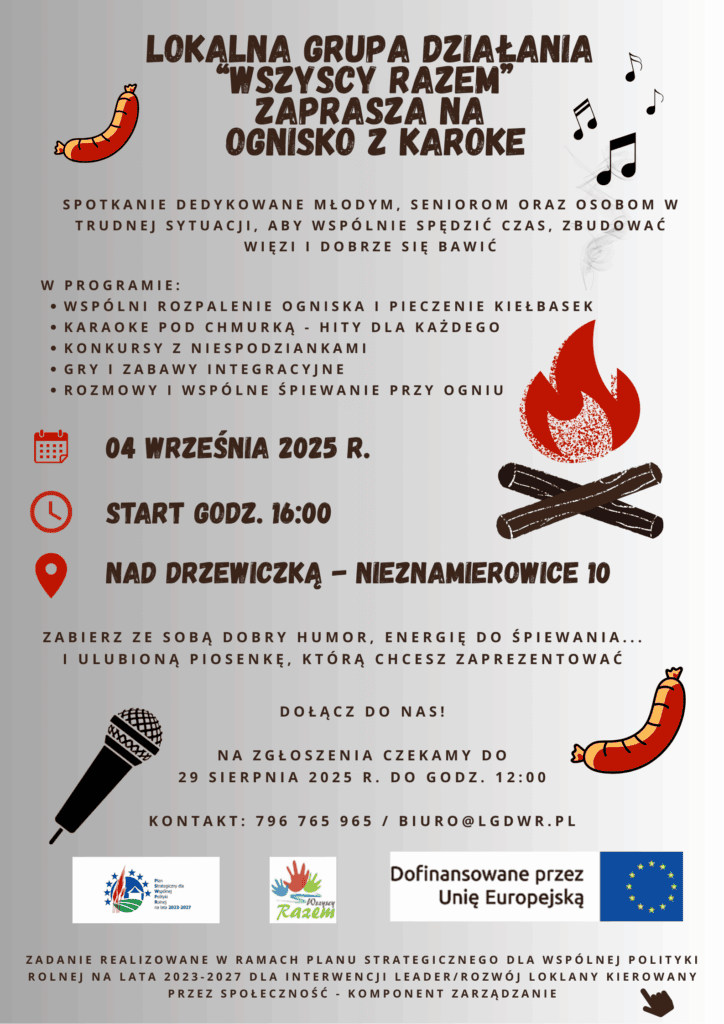 Lokalna Grupa Działania „Wszyscy Razem” zaprasza na „Ognisko z karaoke”. Spotkanie dedykowane osobom młodym, seniorom oraz osobom w niekorzystnej sytuacji.