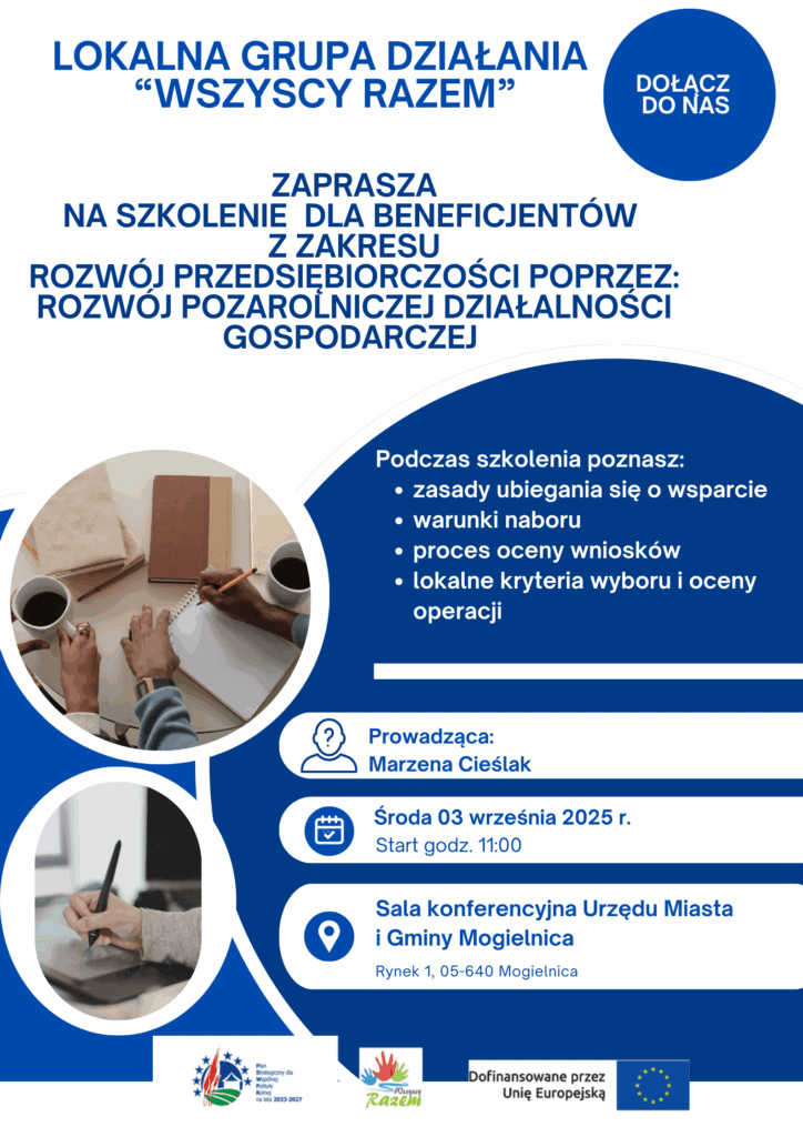 Lokalna Grupa Działania „Wszyscy Razem” serdecznie zaprasza na szkolenie z zakresu „Rozwój przedsiębiorczości poprzez: rozwijanie pozarolniczej działalności gospodarczej” w ramach Planu Strategicznego dla Wspólnej Polityki Rolnej na lata 2023-2027 (interwencja I.13.1 LEADER/Rozwój Lokalny Kierowany przez Społeczność – komponent Wdrażanie LSR.)